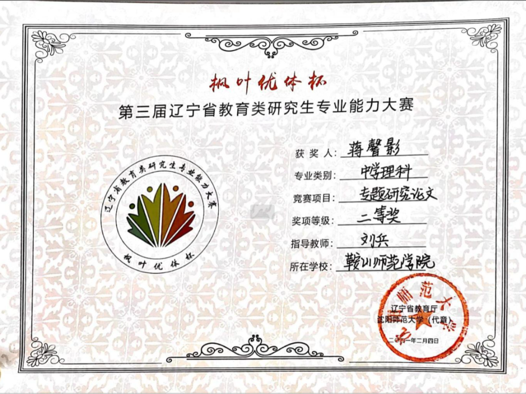 自招生以来,学科教学(数学)方向通过不断改革和优化教学模式,强化实践教学环节,严把学位论文质量关等培养环节,确保人才培养质量稳步提升,培养研究生实现就业率100%,其中1人攻取东北师范大学教育学博士学位。学校注重学生实践技能和创新能力的培养,先后与鞍山市铁东区教育局和铁西区教育局建立稳定的教学实践基地,联合培养应用型人才。学科教学(数学)方向研究生的教育实习统一在鞍山市教学实践基地实施模块式管理,取得显著成效,受到实习单位好评。在读研究生连年在全国“田家炳杯”全日制教育硕士专业学位研究生学科教学(数学)专业教学技能、“枫叶优体杯”辽宁省教育类研究生专业能力等大赛中取得优异成绩。